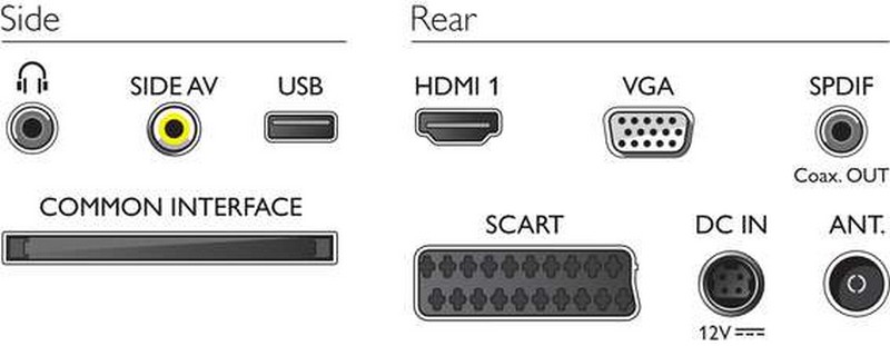•Ostali priključki: Antena IEC75, Standardni vmesnik plus (CI+), Digitalni avdio izhod (koaksialni), PC vhod VGA + avdio L/D vhod, Izhod za slušalke, 12-voltni napajalni vhod